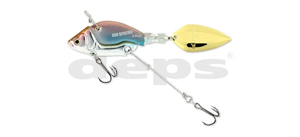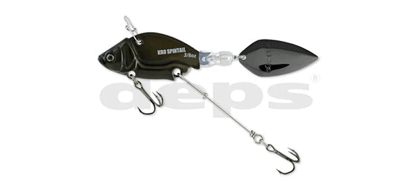 Deps set out to create the greatest tail spinner of all time, and the result was the KRO Spintail! Â The KRO Spintail is made of half lead and half circuit board, which gives the bait a tremendous tight vibration. Â The unique shield-shaped blade is designed to spin effortlessly with very little water resistance and is attached to the bait with a ball-bearing swivel, which allows the blade to spin more rotations than any other tailspin. Â Finally, you will notice the drop-down rear hook. Â Deps discovered in testing that a lot of tail spinner bites happen at the blade, so they designed this hook to swim underneath the blade to all those short strikes are now hook-ups!
