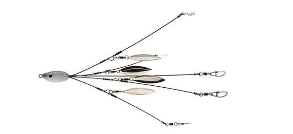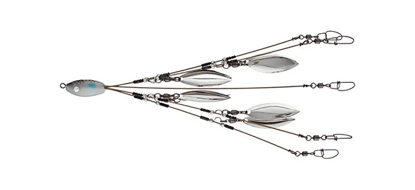 The HogFarmer’s 5-arm rig is a must have for A-rig fishing. Made from heavy-gauge wire, this rig is built to withstand the punishment of holding multiple large fish. This rig comes with 80-lb safety swivel snaps on each arm and your choice of no blades, 4 blades, or 8 blades depending on your needs. Available in the original 5.75 inch and the mini 5 inch versions.Â