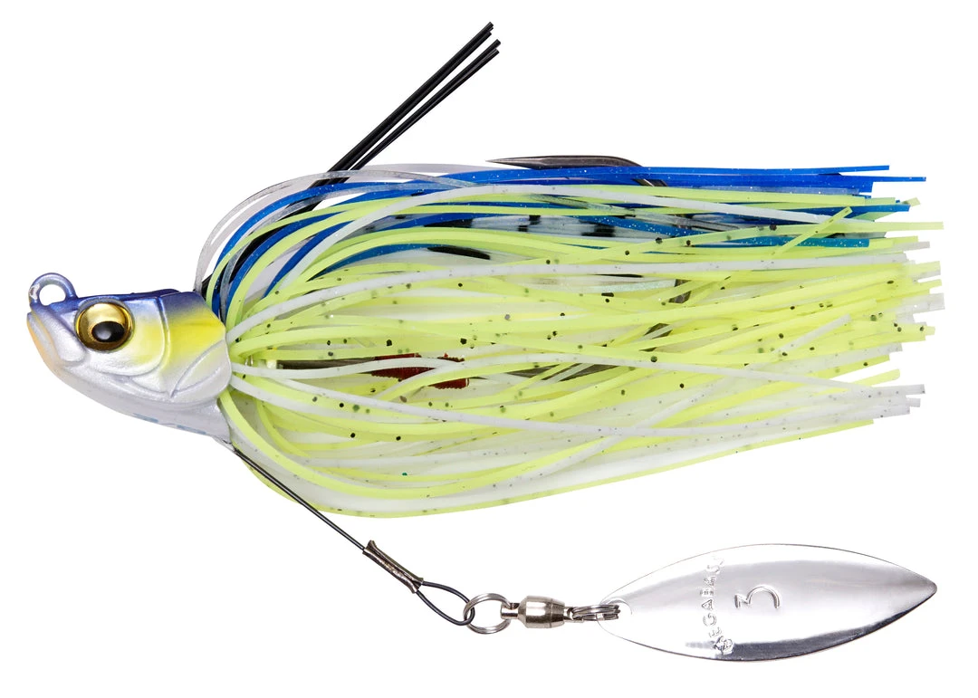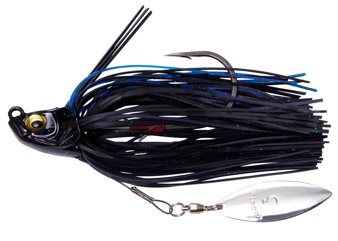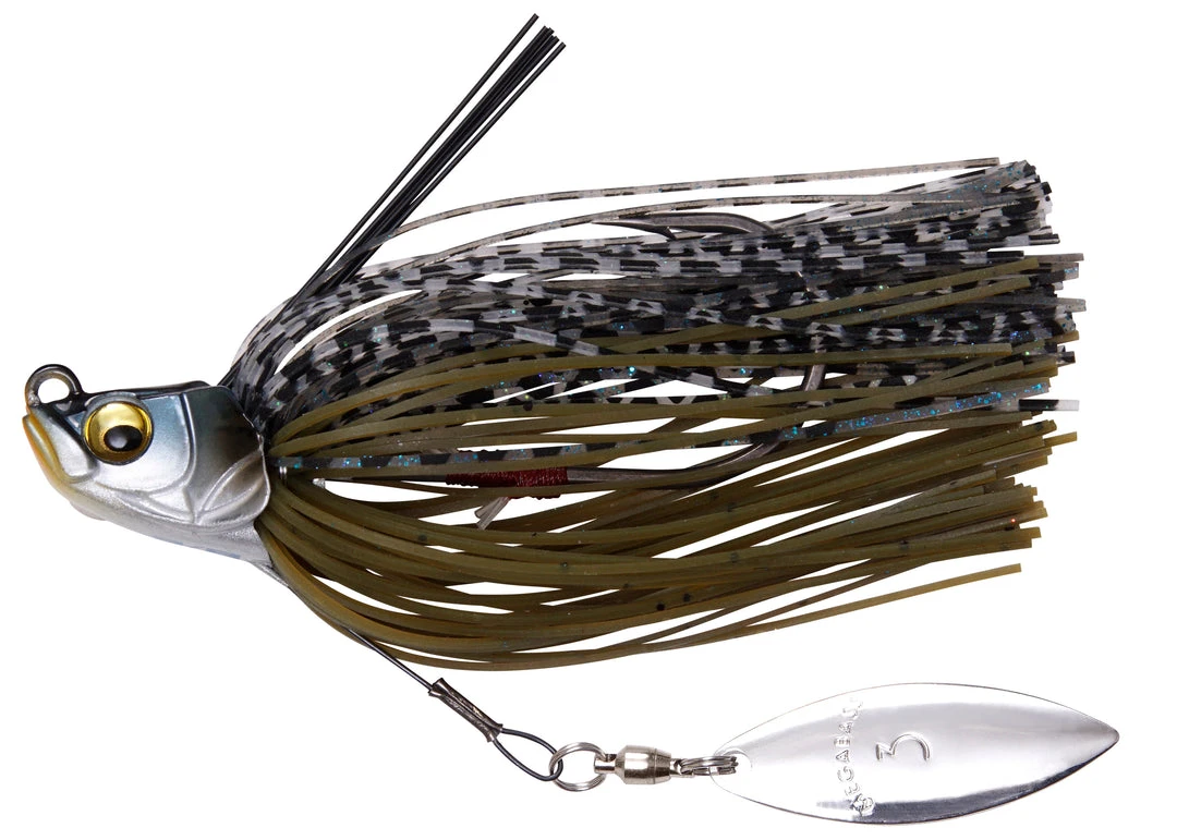 Megabass set out to create the finest swim jig on the market, and the result is the Uoze Swimmer! Â The Uoze Swimmer features a custom shaped head designed to hold a paddle tail swimbait like a spark shad or Keitech. Â The head aides the jig in wobbling side to side subtly. Â Below the head is a titanium wire and willow leaf blade, giving the jig an underspin look for extra attraction. Â A cutting point hook, dual hand tied bait keepers and a wire tied skirt round out the hand crafted performance that is the Uoze Swimmer.
