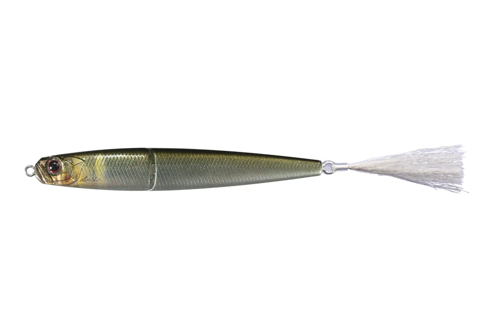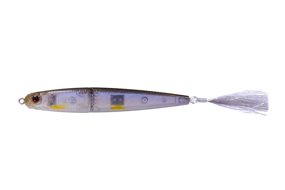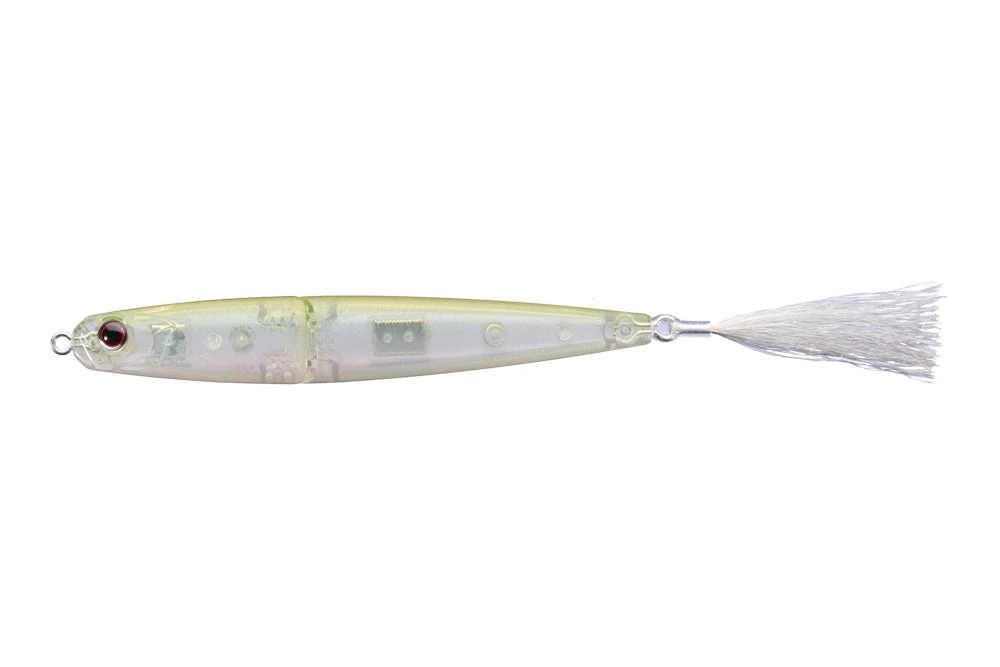 Until now, the i-shaped fishing was considered to be difficult to bring into a part-time job even if there was a chase, and there were several reasons for this. Therefore, we added all the necessary elements to increase the chase, reduce the cut-off rate, and increase the bite rate and catch rate. The retrieve is as slow as possible and set to super slow sinking to keep the range. In addition, the image of a slow-moving, defenseless small fish has adopted a sideways body that is easy for both bass and anglers to see. Easy to see makes it easy to send to the spot you want to aim for, and the bite doubles. In addition, the joint part absorbs the vertical movement of the entire lure due to the blur of the rod tip, the blur of the retrieve, the wave, etc. that cause the U-turn as much as possible, and the natural movement is maintained. In other words, it is a joint not to move but to prevent inadvertent movement. Also, when stopped, the front body will fall slightly while lowering, and if you dive too much, you can lift the front body slightly to raise the swim range. The hair is made of a special chemical fiber that sways like a fin of a small fish when soaked in water, and the structure without hooks on the tail makes the bass react strongly. In addition, the 2-hook system drastically reduces the number of i-shaped slips. In this way, the lure achieved a big bait-like fish collecting power, a no-sinker worm-like eating power, and a catch rate for a small but big bass.