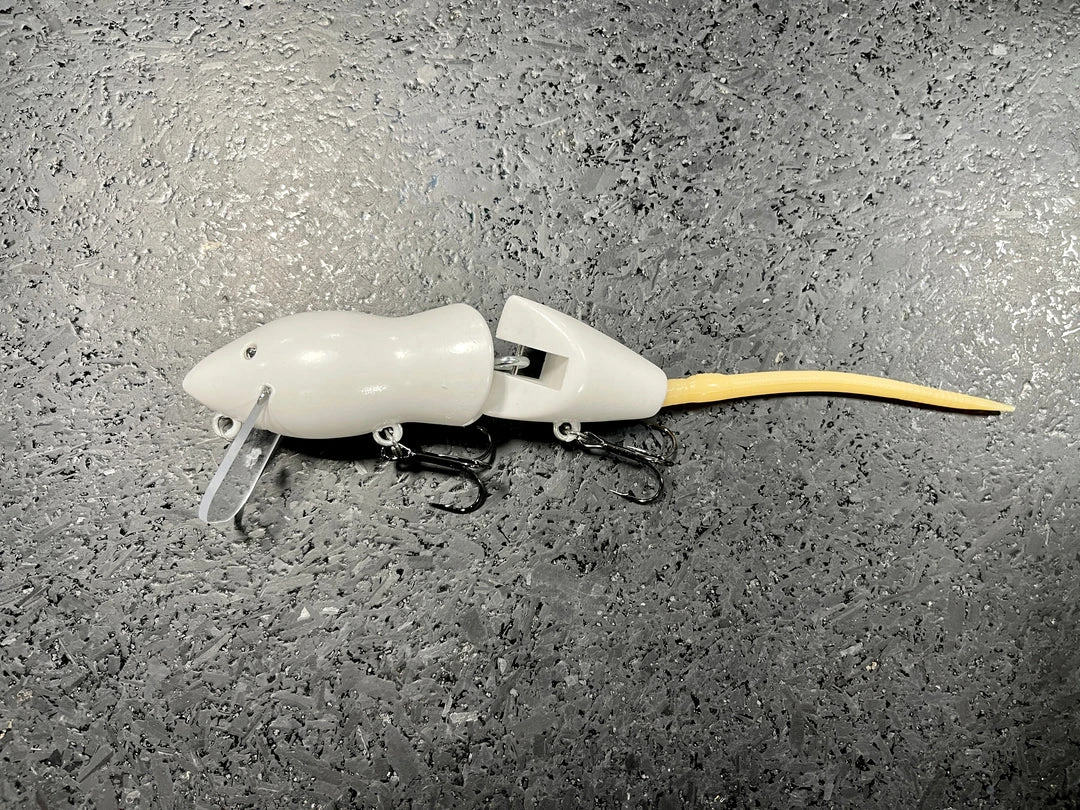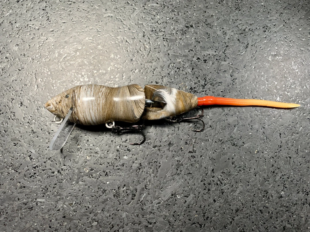 The PB Rats are a resin made rat wakebait designed with a sleek contour body and wide bill built for a wide searching action. The PB Rats are available in 2 piece and 3 piece body segment models, equipped with VMC split rings and Owner ST-36 size 1/0 trebles in the front and size 1 in the back. Each bait is hand made so the density of patterned swirls varies from bait to bait. Tails are screwed in with a cps twist lock and can be easily changed out and customized.